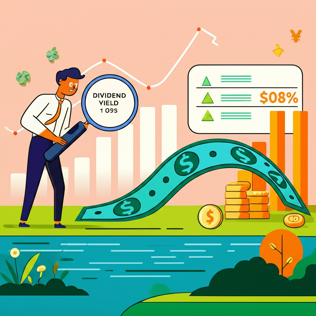 投資人透過放大鏡檢視股票圖表中的殖利率數字,象徵穩定收入的現金河流在充滿活力的金融景觀中