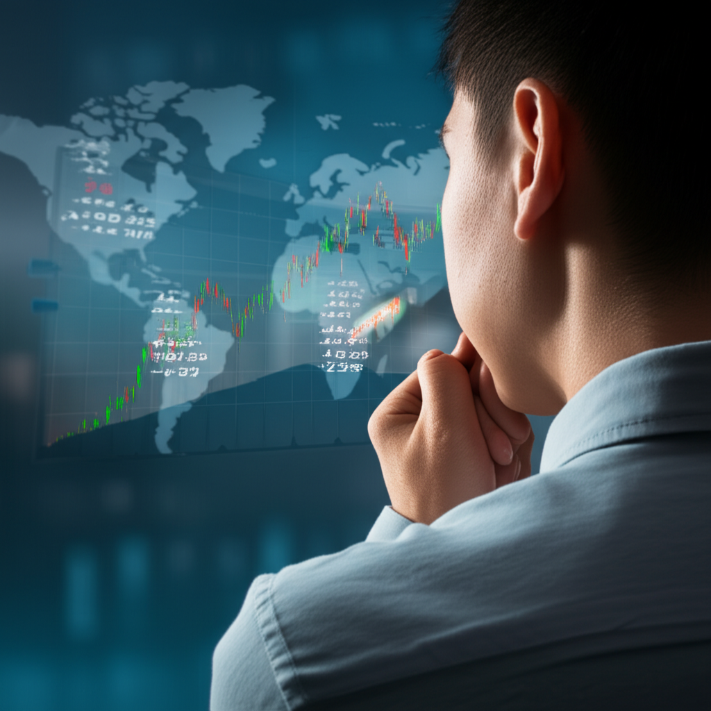 一位投資者觀察香港股市圖表,背景有世界地圖顯示全球投資機會