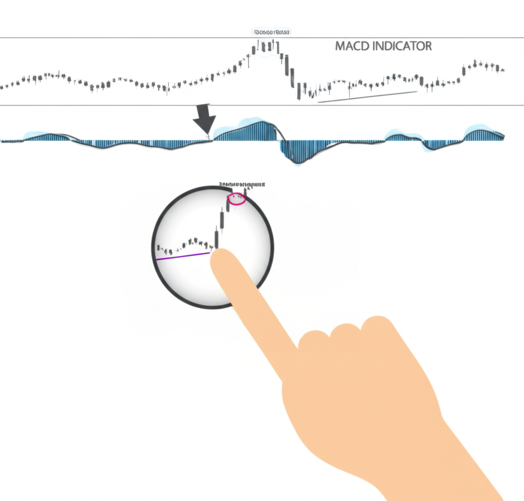金融圖表顯示MACD背離指標的插圖,放大鏡突出轉折點,手指指向圖表象徵市場分析與投資決策