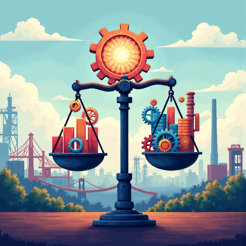 工業生產指數像素藝術圖,展示齒輪和圖表在經濟景觀中的平衡