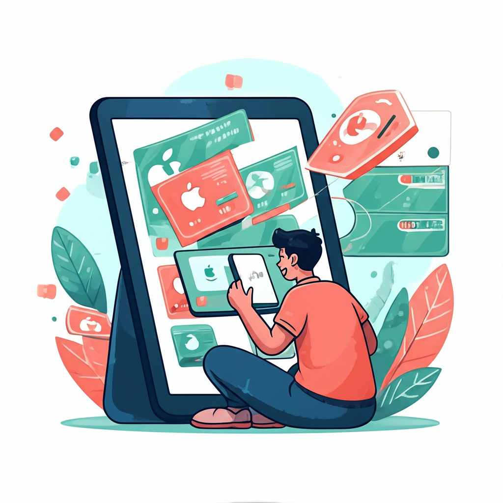 小資族透過平板購買蘋果和亞馬遜等巨頭股票的零股插圖,象徵高價投資變得親民